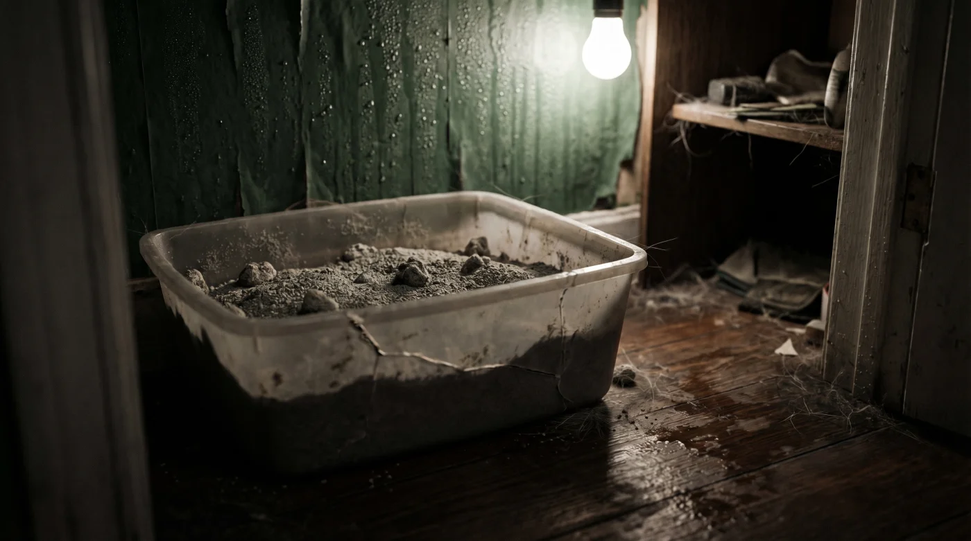 Hablamos de la arcilla de bentonita pura. Un simple tazón de arena para gatos colocada estratégicamente. Esto no es un truco temporal de internet; es una intervención estructural del microclima de tu guardarropa que trabaja mientras tú duermes.