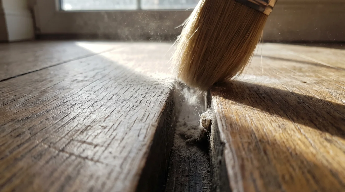 No todas las superficies requieren la misma intensidad en el trato. Para los puristas que habitan espacios con pisos de duela original, el respeto a la veta es primordial. En estas maderas sólidas, las juntas suelen ser más anchas. Aquí, el talco no solo lubrica, sino que previene que la fricción futura astille los bordes desgastados por décadas de pasos cotidianos.
