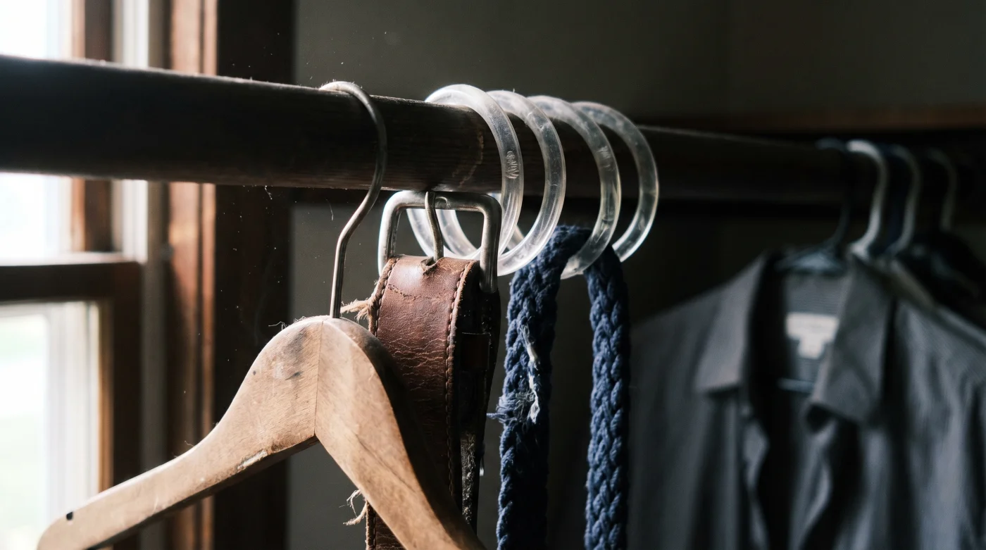 Tu caja de herramientas táctica para esta renovación es deliciosamente mínima y barata. Solo necesitas un gancho de saco robusto (capaz de soportar unos 3 a 5 kg de accesorios sin curvarse en el centro), un paquete básico de 12 a 24 aros de cortina con cierre de seguridad (alrededor de $35 a $50 MXN en cualquier ferretería), y confirmar que el tubo de tu clóset tenga una altura libre mínima de 1.20 metros para evitar que las puntas de los cinturones arrastren por el suelo atrayendo polvo.