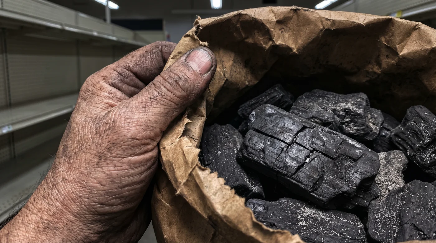 Hasta que llegas al pasillo del supermercado de la esquina. Caminas con la confianza del que domina su territorio, esperando encontrar la habitual montaña de sacos negros de tres kilos, pero te recibe un estante vacío. El polvo negro esparcido en el linóleo blanco es la única evidencia fantasmal de que alguna vez hubo combustible allí. Un escalofrío de pánico logístico te recorre la espalda.