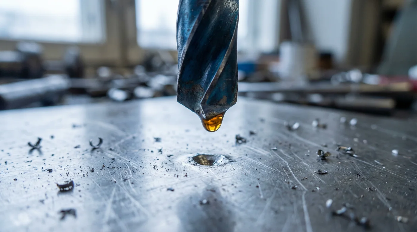Toma tu taladro y ajusta la velocidad antes de acercarte a la pieza de trabajo. Para metales duros, necesitas girar muy lento, controlando el gatillo con absoluta suavidad. Antes de que la punta de cobalto toque el acero por primera vez, coloca una sola gota de aceite de corte justo en la marca de perforación. Este pequeño charco será tu escudo térmico protector en la zona de mayor fricción.