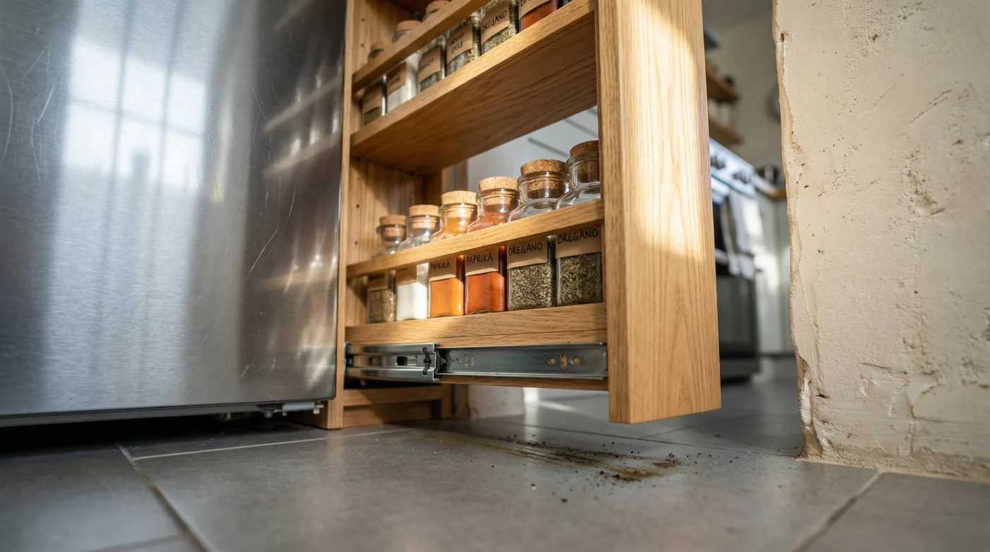 Aquí es donde la magia de los rieles extraíbles de extensión total cambia las reglas del juego. Al montar una estructura vertical esbelta sobre estos herrajes industriales, el acto de organizar se vuelve una experiencia táctil. No estás apilando latas en el fondo de un gabinete oscuro donde caducarán en el olvido; estás atrayendo toda tu despensa hacia la luz de la cocina con un solo tirón suave de tu mano.