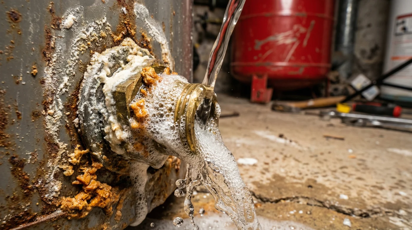 - Vuelve a abrir la válvula de drenaje inferior y simultáneamente abre el suministro de agua fría para provocar un enjuague a presión. Verás salir agua turbia, lechosa y con pequeños trozos blancos. Esa suciedad es la vida útil que le acabas de restituir a tu máquina de calor.
