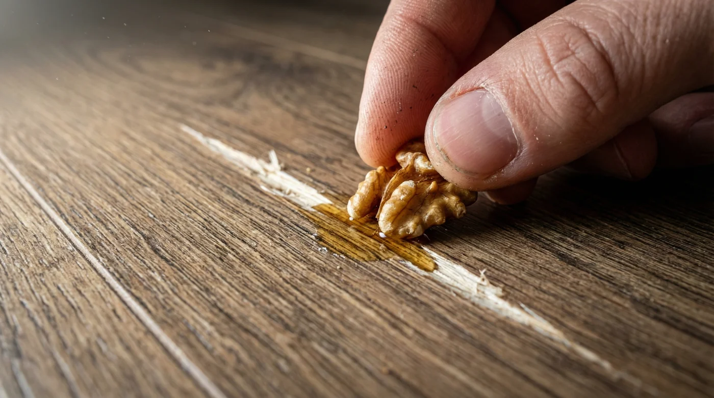Si tienes pisos oscuros o rojizos, el contraste de un rayón es evidente. Aquí puedes mezclar el aceite de nuez con una pizca microscópica de café instantáneo muy fino; la grasa transportará el pigmento natural hacia lo más profundo de la herida, sellando el color de manera permanente.