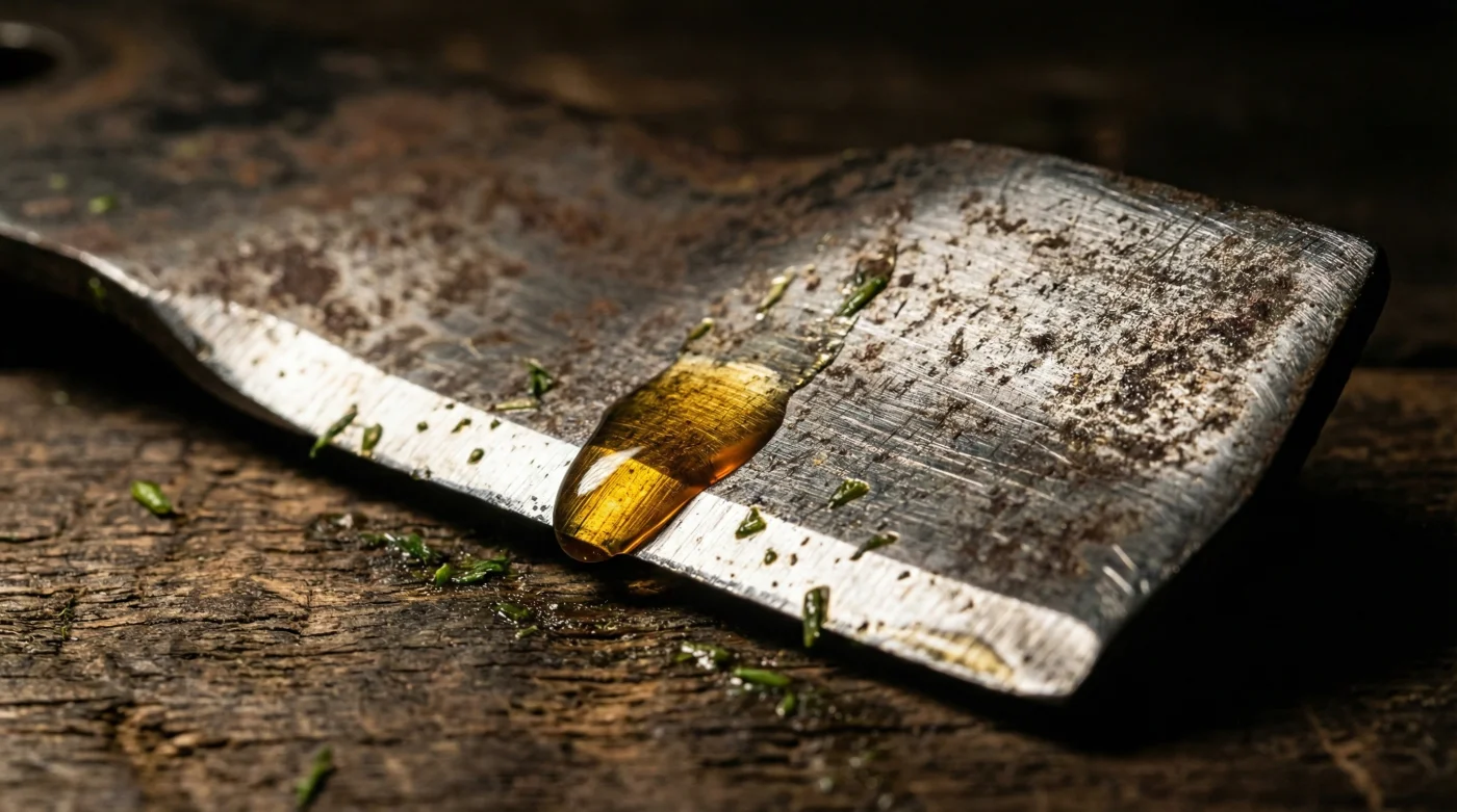 Al aplicar una película microscópica de aceite de cocina, cambias la física del impacto. Creas una barrera hidrofóbica donde la savia simplemente resbala. Contradiciendo el instinto de afilar semanalmente, descubres que evitar la adherencia mantiene la hoja intacta durante meses.