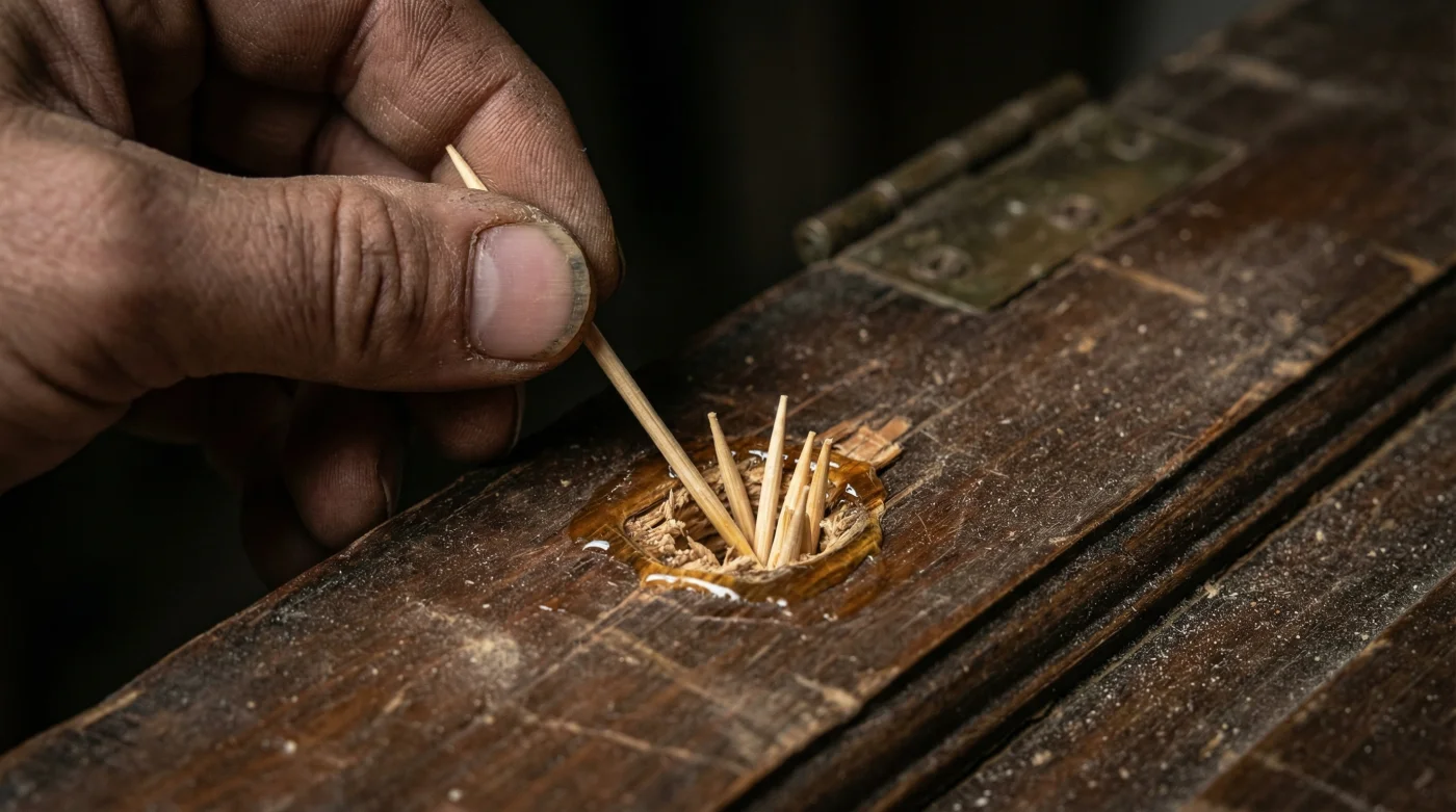 Aquí es donde la inmensa mayoría comete el error más común del mantenimiento casero: caminar hacia la ferretería para comprar un tornillo más grueso y más largo. Piensas que forzar más metal resolverá la debilidad de la estructura, apretando las fibras a la fuerza. Sin embargo, lo único que logras es fracturar la madera sobreviviente, comprando apenas unas semanas de estabilidad antes de que la falla regrese con un daño mucho más agresivo.
