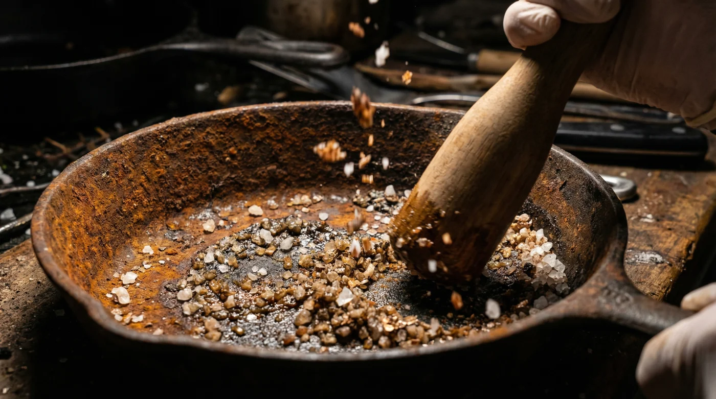 La sal no juzga los descuidos del pasado, simplemente aparta el óxido del camino para que el hierro vuelva a respirar bajo el fuego puro de tu cocina.